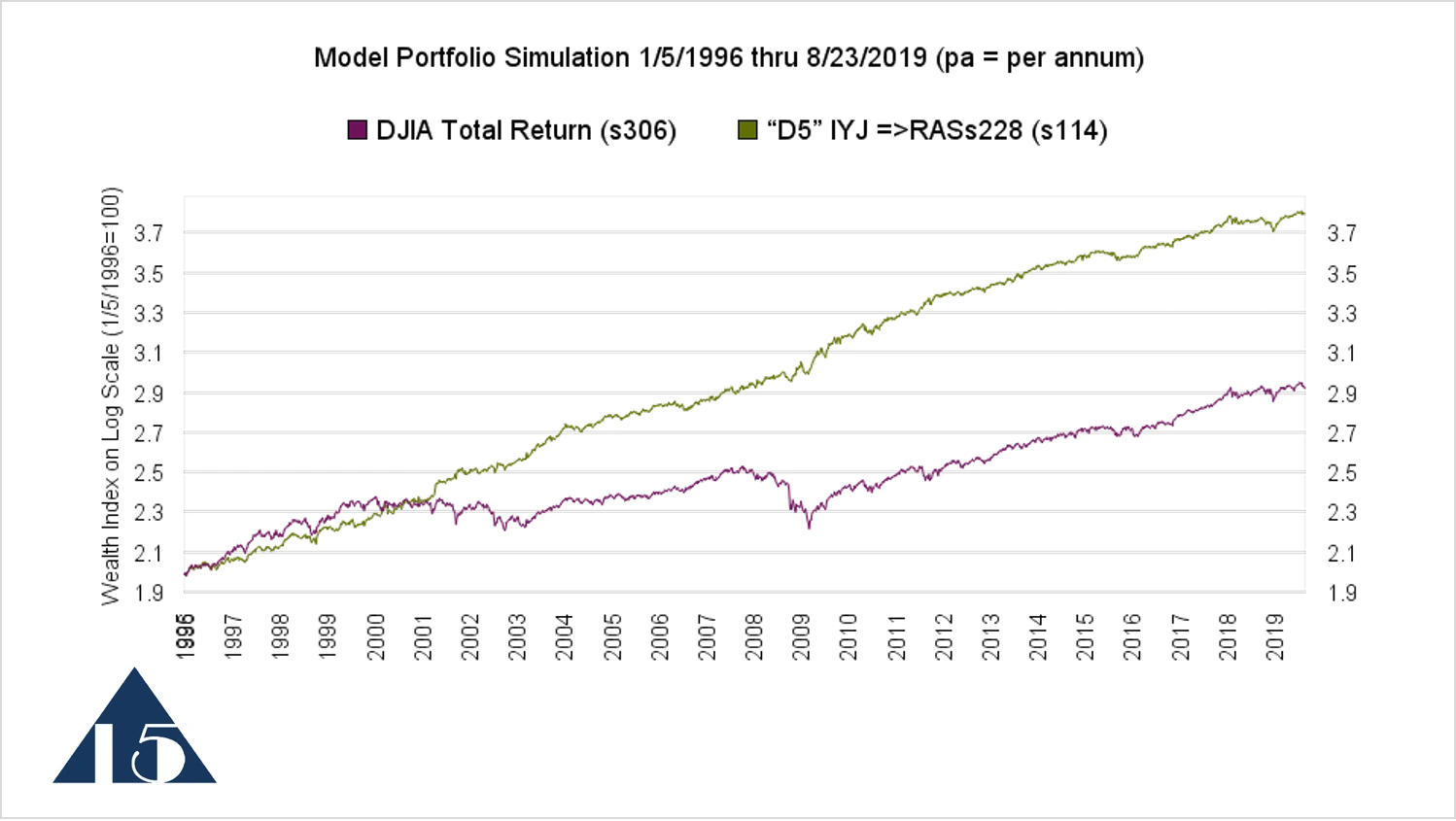 This is an example of a chart from a Focused 15 model portfolio. This is on a log scale, beginning, in this case, on January 5, 1996, set at 100, which shows as a 2 on the vertical log scale. The model portfolio is shown by the green line. It is moving in a diagonal fashion at a relatively constant slope.