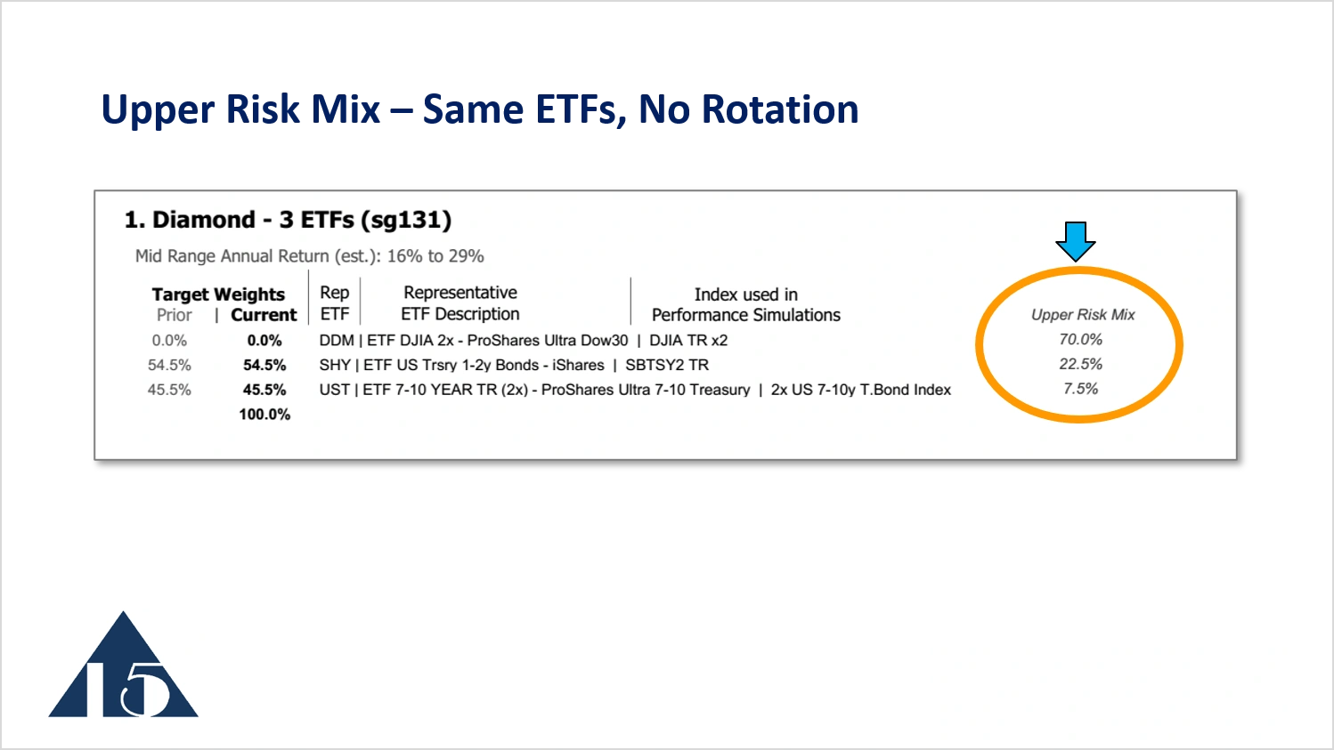 The upper risk mix is shown in the publications at the upper right, as in the above image of one of the model portfolios. The image also shows the current target weights, representing the asset allocation decisions and the ETF rotation decisions that come from the Focused 15. In this case, the upper risk mix indicates 70% of the portfolio’s assets are held in ETF DDM. In the image, the current target weight shows 0% allocation to this stock-related ETF.