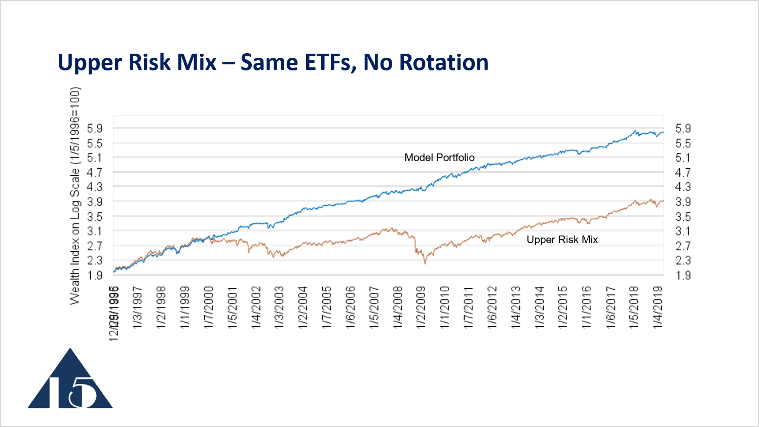 The upper risk mix is shown in the tan line. We can see in this early time period, beginning in 1996, that the model portfolio, in blue, actually underperforms the upper risk mixed during the early part of the period. But when the stock market and the upper risk mix start to decline beginning in 2000 through to 2003, the traded portfolio moves higher. So clearly the model portfolio is superior. It has better returns and better loss avoidance than the upper risk mix.