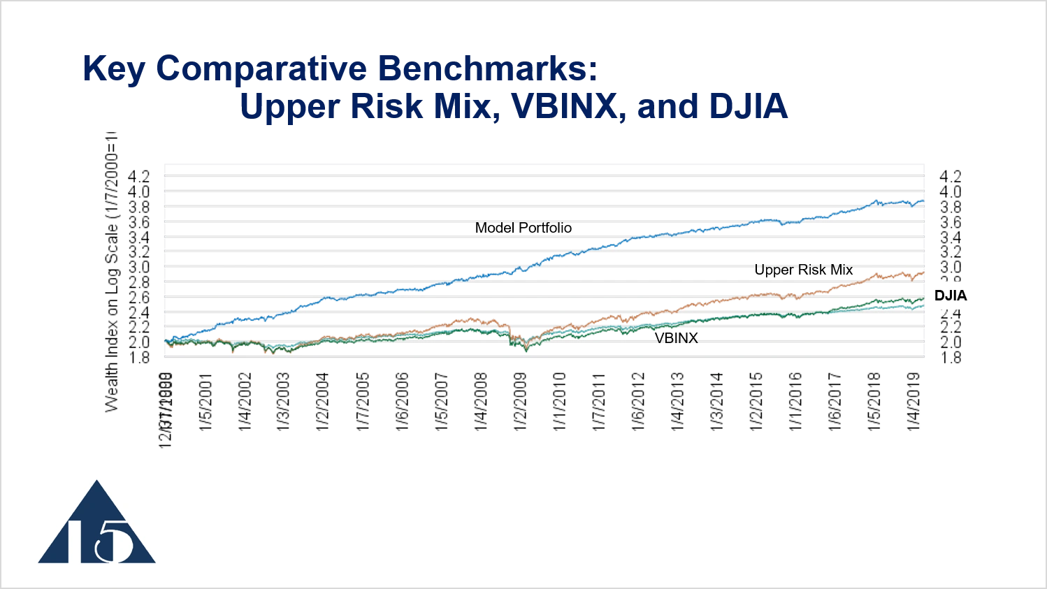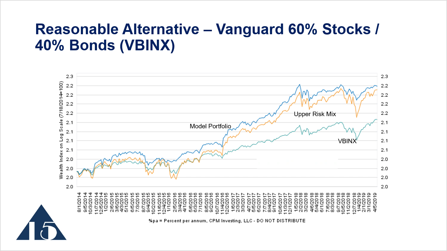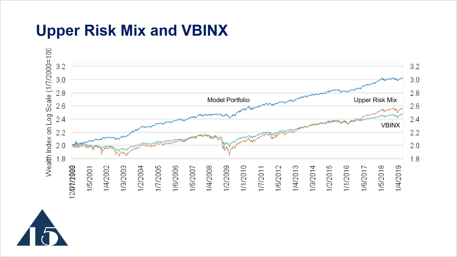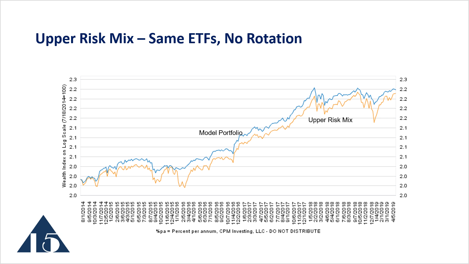Looking at the upper risk mix over a shorter period of time, 2014 to 2019, we see the model portfolio outperforming the upper risk mix and then keeping pace with the upper risk mix when the market moves higher. Then, during the period of volatility, the model portfolio avoids some of the losses of the upper risk mix.