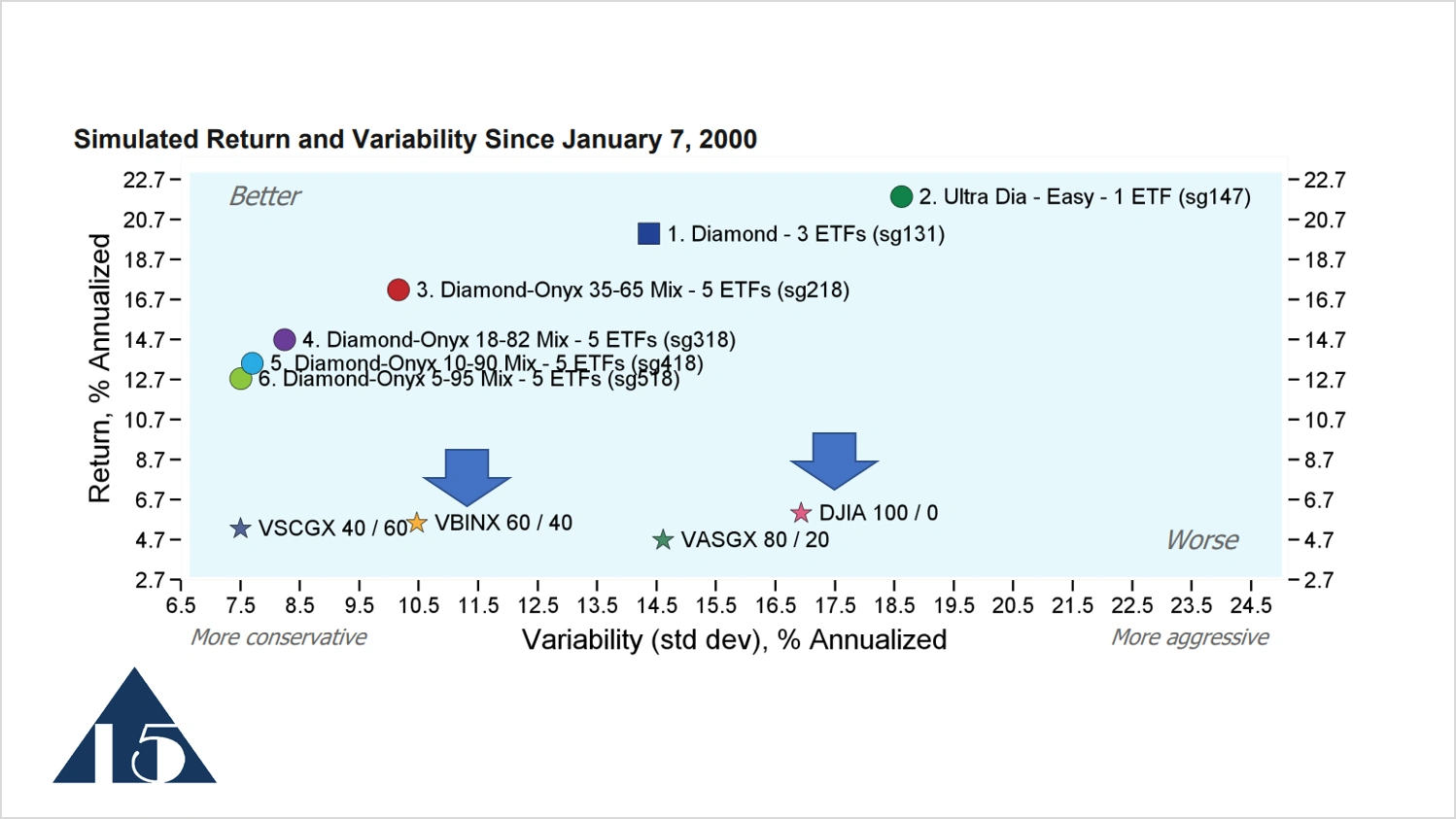 Investments in the upper left hand quadrant of this chart are most attractive. It has high return and low variability, which is a good thing, and is better, as indicated by this label. The opposite lower left hand quadrant is high variability and lower return, which is worse. The fund VBINX is shown in this spot and has a return of about 5% annualized since 2000. The variability is just about 10.5%. The DJIA has variability of about 17% and a return a little bit higher than that of VBINX, of about 6%. The model portfolios have performed well in simulation over this time period. VBINX and DJIA, give you a good idea of the level of return and variability that many investment programs offer relative to the Focused 15 Investing model portfolios.