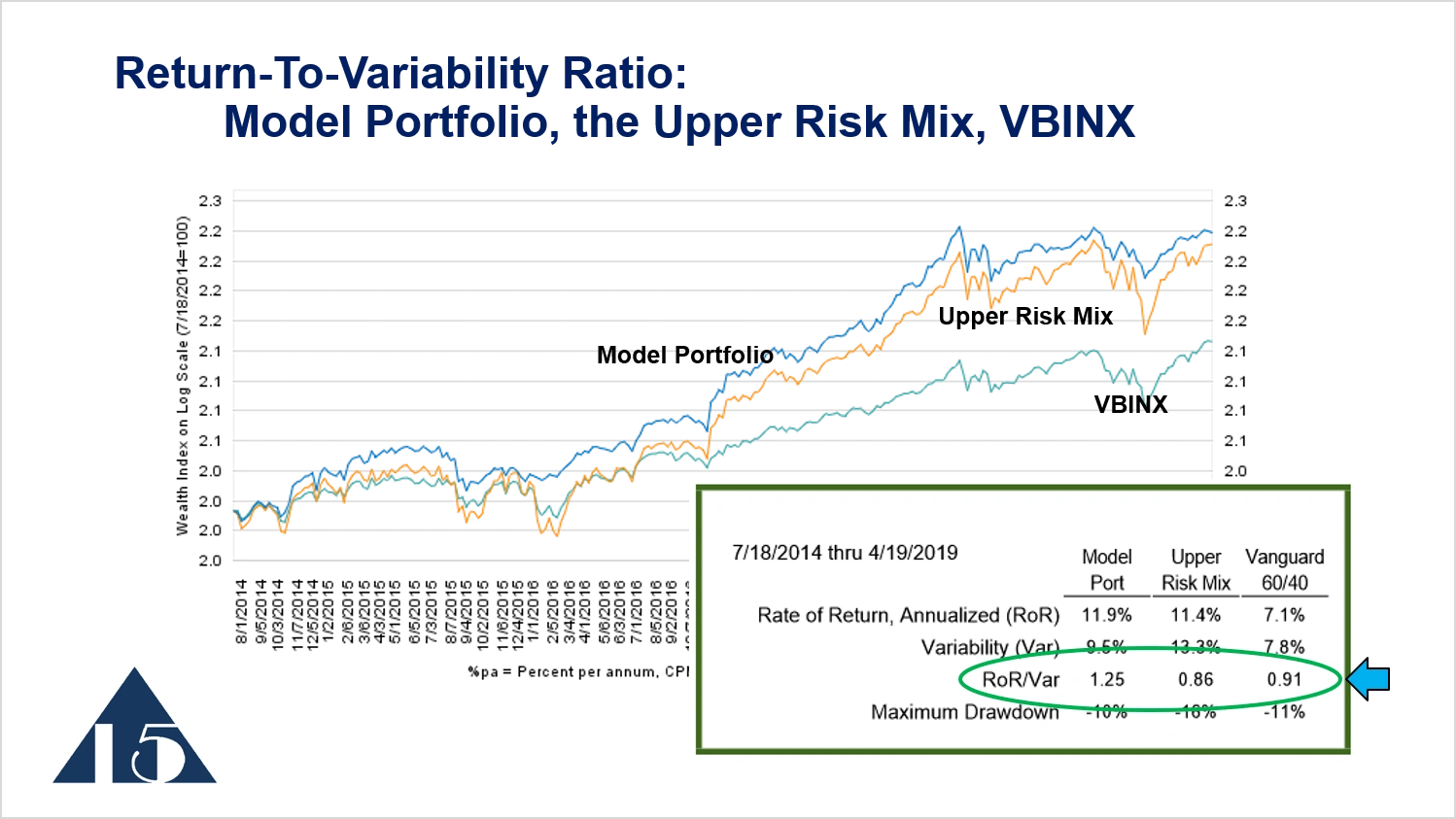A key metric that we look at, particularly over mid to longer periods of time, is the ratio of return to variability. The table at the bottom of the chart shows the rate of return on an annualized basis for these different investments. The Model Portfolio has annualized return of 11.9%, the upper risk mix has a return of just slightly less, 11.4% on annualized basis. VBINX has a return of 7.1%. The variability, which is the standard deviation of weekly returns on annual basis, is 9.5% for the model portfolio—quite a bit less than upper risk mix’s variability of 13.3%. VBINX has variability that is lower than the others at 7.8%.