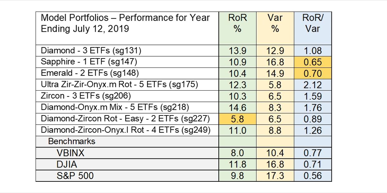 The table below shows performance statistics for the model portfolios in the Diamond publication for the year ending July 12, 2019.