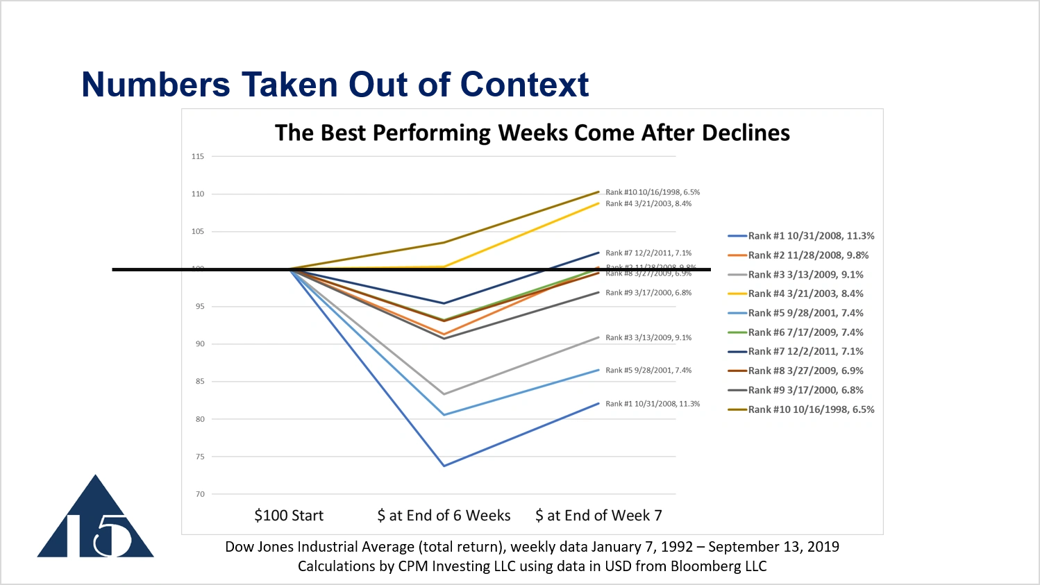 Let's take a look at the best-performing week, which was October 31, 2008, with an 11.3% return. That 11.3% return indicates the return for the one week - a very high return. But over the six weeks prior that strong performing week had very low returns. In fact, the decline over the six-week period just prior to this stellar week, the market dropped by over 25%. The rebound of 11.3% is clearly good, but you would have been better off by missing both the 25% decline and 11% rebound.