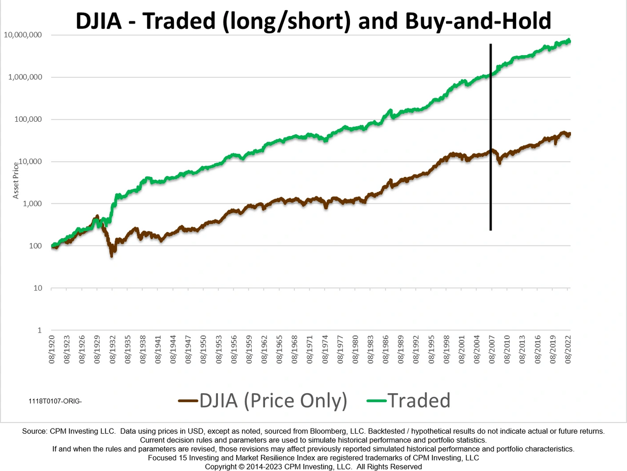 Our loss-avoiding algorithms have produced strong results, as evidenced by the performance of the green line in the figure above. This line is a simulation of the performance produced by trading long and short positions in the Dow Jones Industrial Average index based on our algorithms. The performance of the DJIA (buy-and-hold) is indicated by the brown line. The figure shows from 1918 through early 2023.
